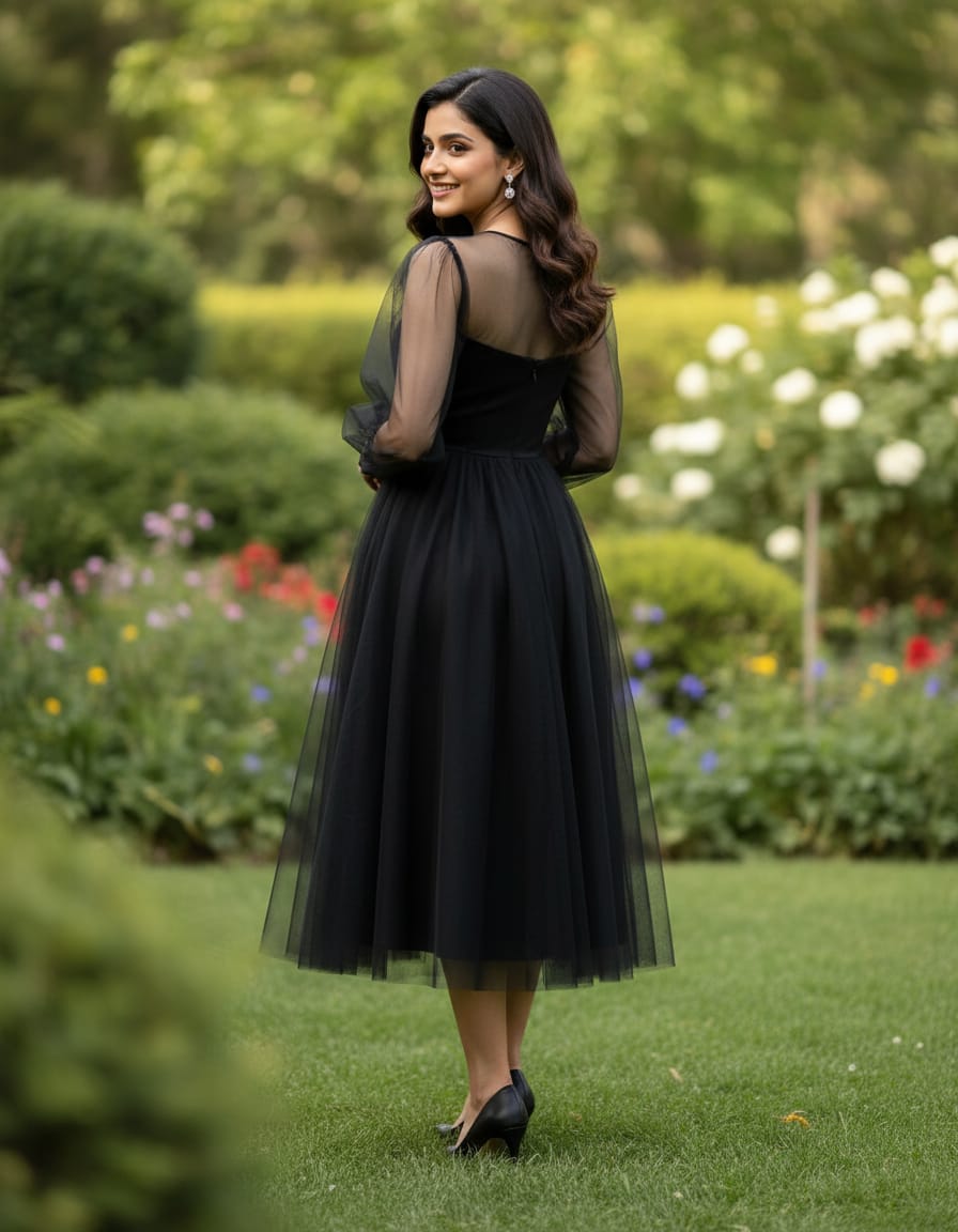 Black Color, Plain Net, Full Length Balloon Sleeves Frock