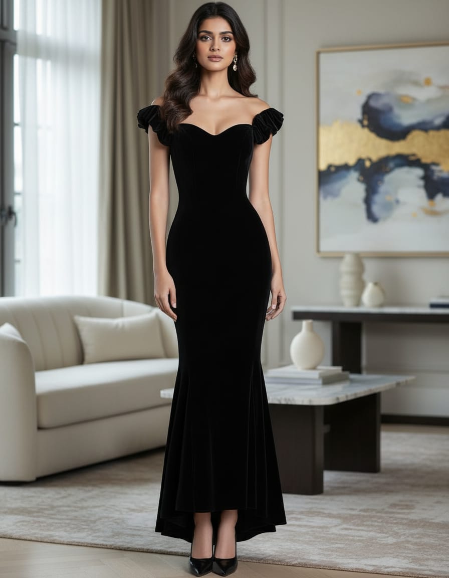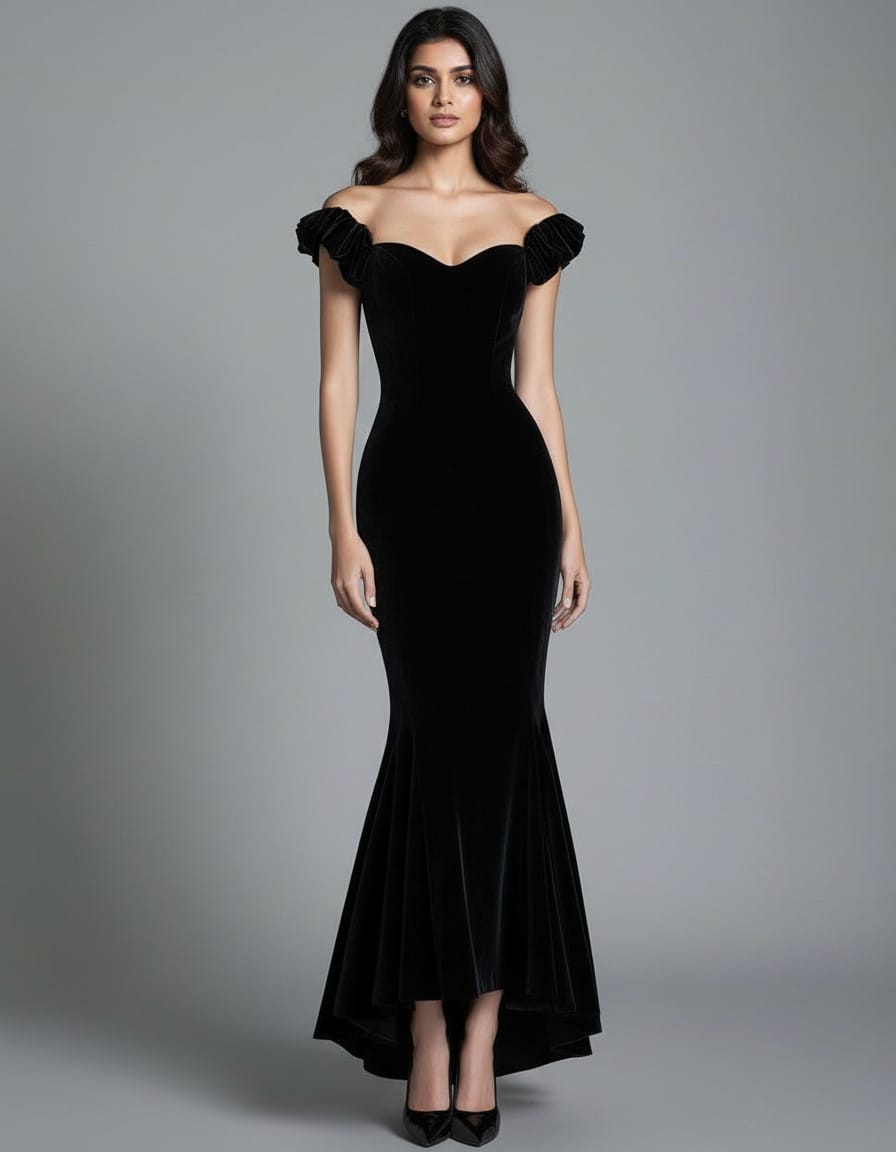 Black Velvet Off Shoulder Full Length Gown