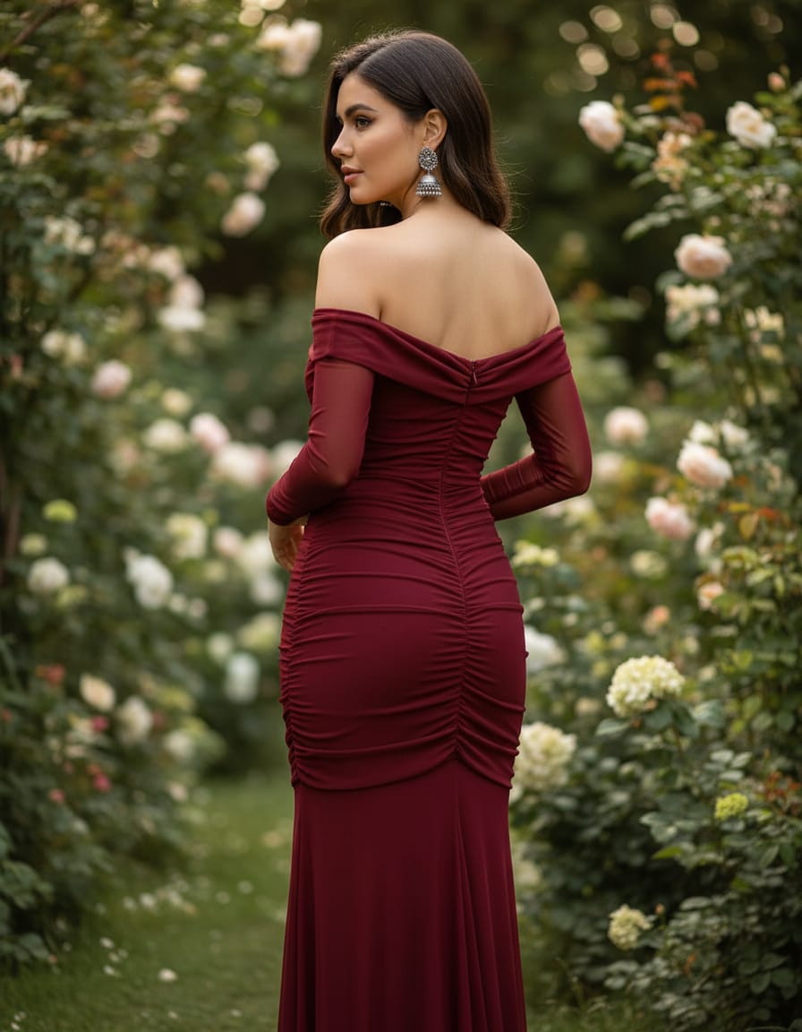 Dark Scarlet Color-Ruched–Lycra-Off Shoulder-Body Con Dress