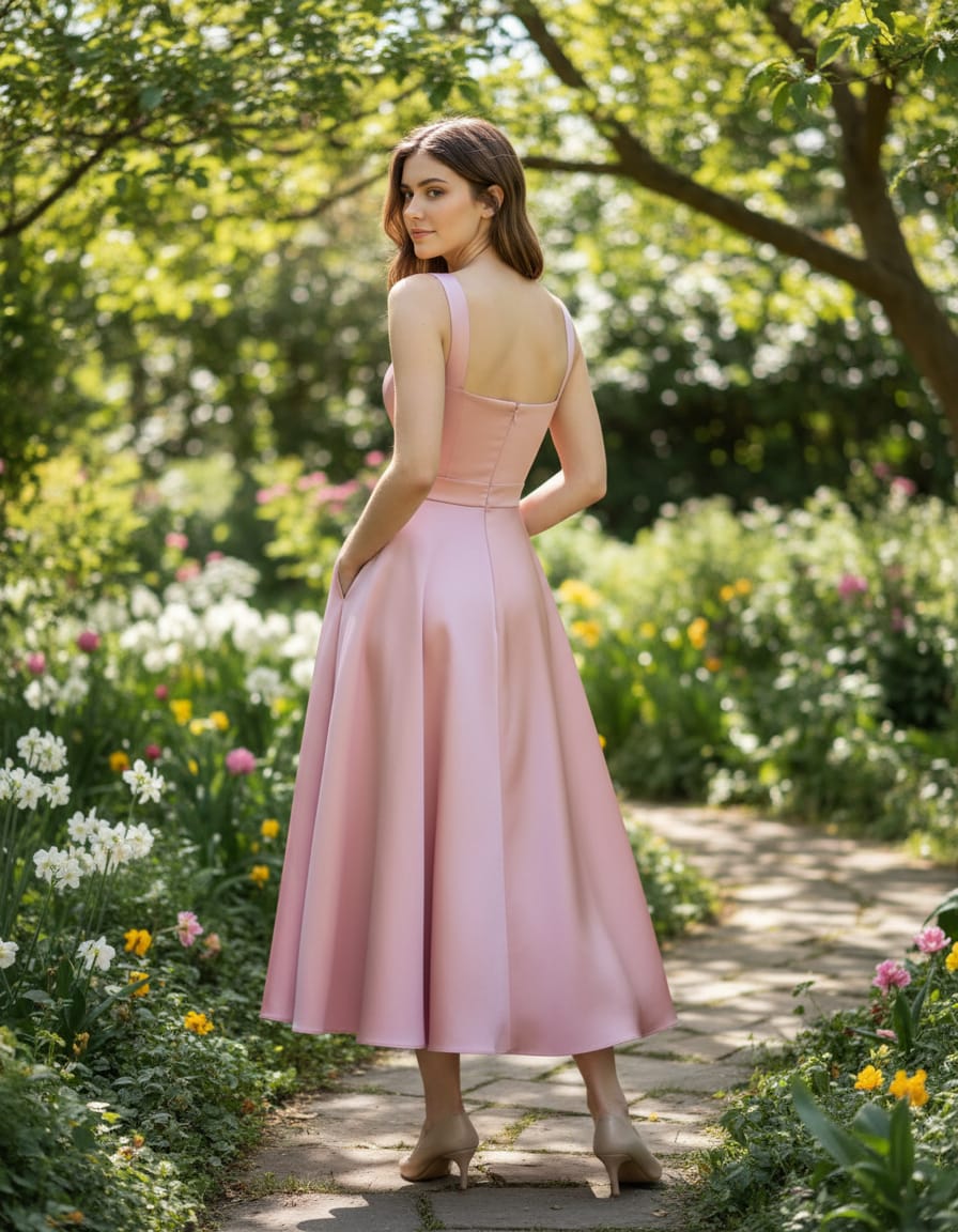Oyster Pink Satin Frock Square Neck Sleeveless, Size - MediumOyster Pink Satin Frock Square Neck Sleeveless, Size – Medium